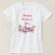 A Mother's Day t-shirt with large pink and purple watercolor magnolia flowers with green leafy accents