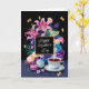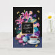 This stunning and heartfelt Mother's Day card features watercolor illustration of a floral arrangement in shades of pink, purple, and blue. Set against a dark background, this artistic design exudes elegance and warmth. At the centre, a golden chalkboard bears the heartfelt message 'Happy Mother's Day.' Surrounding the flowers are delectable pastries, including colourful macarons and a cup of red tea with an ornate saucer, creating a delightful scene of celebration. The deep blue backdrop enhances the enchanting ambiance, while golden butterflies scattered throughout add a touch of whimsy. Perfect for expressing your love and appreciation, this exquisite card is sure to make Mum's day truly special.