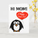 Happy Mothers Day greeting card with cute penguin holding a red heart balloon.