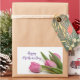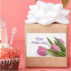Pink tulips are near text 'Happy Mother's Day' in purple script.