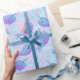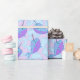 Adorable, chubby narwhals swimming amongst swirling waves on a pink background.