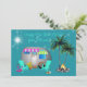 Happy new year cards with camping trailer design and custom text. Wish friends and family a Happy New Year from the campsite. This design is made up of a little silver camper, surrounded by palm trees, a campfire, chairs, lawn flamingoes, and a seashell. Text is added over a starry sky.
