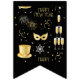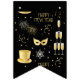 This bunting banner displays the words "Happy New Year" in a unique/fine print font with golden coloured letters plus fireworks, confetti, mask, hats, and champange glasses shapes and patterns in this New Years theme and style. All banners have single sided printing outdoor safe made with sturdy plastic polystyrene and thick plastic rope has (16) 5.5" x 8" swallowtail flags on a 6' long string.