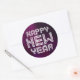 Customisable Happy New Year stickers for a sparkling New Year's Eve party with flashy glittering text on silky purple (background colour can be changed).
