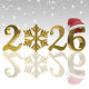 This elegant illustration features the year 2026 in shiny golden typography. The zero is replaced by a detailed gold snowflake, while the final number is decorated with a red Santa hat. The design has a luxurious and festive appearance, making it ideal for Christmas and New Year greetings.