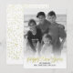 a simple Gold Happy New Year Script with a feathered white border. A simple elegant calligraphy script. This classic design features a full bleed and holds 1 photo. The backside of this card has a white background with speckled Gold Confetti.