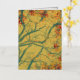 A very finely drawn green tree with red and orange leaves on a gold background.