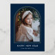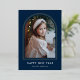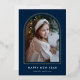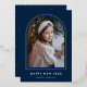 Welcome the new year in style with this modern holiday photo card, featuring your vertical photo showcased within a sleek navy arch frame accented by a luxurious gold foil border. The phrase "Happy New Year" is displayed in elegant white lettering, along with your family name for a personalized touch. This foil New Year card combines contemporary design with a touch of elegance, making it a perfect choice for celebrating the season and sharing your warm wishes with loved ones.
