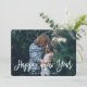Send your loved ones a holiday greeting with a stylish Happy New Year photo card. The photo card features the words "Happy New Year" in a modern script font, a photo and text placeholder, and a white and gold dot pattern on the back.