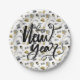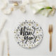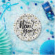 Happy New Year party- white background, kiss me, bow tie, silver and gold hat, champagne bottle and drink, midnight clock