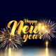 Happy New Year golden text with fireworks and dark blue background, festive celebration, postcard design, elegant typography, for the holiday season.