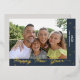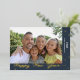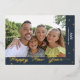 This simple New Years photo card is accent with stunning gold foil. The design offers a horizontal photo, script calligraphy and subtle starbursts on a dark blue background.