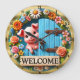 This circular wall clock showcases a charming scene with a smiling pink pig peeking out from behind a blue wooden gate. The gate is surrounded by a vibrant array of colourful flowers including daisies, roses, and bluebells, forming a beautiful floral wreath. A "WELCOME" sign hangs below the pig. The clock is encased in a golden, ribbed frame.