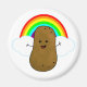 Cute cartoon potato with a big happy smile on his face. Behind him is a bright multicolored striped rainbow with fluffy white clouds at either end.