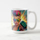Pop art comic book style woman with undercut giving an upper cut pow punch rainbow lgbtqia+ sunglasses coffee cup.