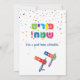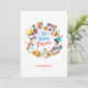 Happy Purim greeting card. Translation from Hebrew: Happy Purim! Purim Jewish Holiday poster with stars of David, traditional Hamantaschen cookies, gragger toy noisemaker, balloons, musicians, masks, Purim basket on festive confetti background. Wish a great Purim celebration. Carnival, Masquerade, Festival, Kids Party, Israel. Invitations & Stationery > Greeting Cards > Holiday & Seasonal Gifts Card. Design with text template. Personalise them by adding name or wishes text. 2023