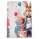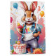 Smiling cartoon rabbit with cake. Great design for gifts for kids of any age.