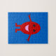 This awesome puzzle features a cartoon of a smiling red grape with shiny black eyes and a pink mouth standing against a blue background with its arms open wide.