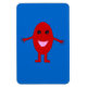 This awesome magnet features a cartoon of a smiling red grape with shiny black eyes and a pink mouth standing against a blue background with its arms open wide.