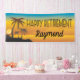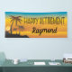Happy retirement party banner with a beach scene in gold and blue with palm trees on an island and elegant fonts. Edit the name to your guest of honour. Fun for your beach loving coworker or any retirement party.