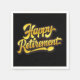 This stylish Happy Retirement napkin features bold, golden-yellow script glowing against a sleek black background. The metallic look of the lettering adds a touch of elegance and celebration, making it perfect for retirement parties, office send‑offs, or family gatherings. The high‑contrast design instantly elevates any table setting and pairs well with both modern and classic décor themes.