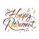 Watercolor lettering that reads "Happy Retirement" in a whimsical, calligraphic style, with the letters transitioning through a rainbow gradient of colours, from red to orange, yellow, green, blue, and purple, scattered confetti and streamers in matching colours around the lettering, set against a clean white background.