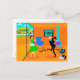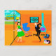 This Happy Retro Parents Postcard shows a mum and dad rejoicing as their child makes a dash for the school bus. The celebrating duo are in their 1960's style, mid century modern, living room. The orange decor is anything but understated. There is turquoise, cone fireplace and a bright, blue, egg chair against an orange, stone wall. On the wall, there is Mid Century Modern Globe Art Stretched Canvas Print, which is available from StrangeLittleOnion's own Zazzle store. On the floor, there is a blue and black portable record player with several vinyl albums scattered nearby. Dad, is wearing a black suit with a light blue dress shirt and darker blue tie. He is breaking out all of his best dance moves--the kind that would bring eye rolls from junior. Mum is wearing a vibrant, green dress and a flouncy, white apron with blue trim. She is standing in front of sliding glass doors cheerfully waving as her child runs down the front sidewalk towards the waiting yellow school bus. Through the doors, we can see their perfectly manicured, suburban lawn and proverbial, white picket fence. Even the background looks happy with a turquoise sky and the silhouettes of cedar trees.