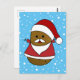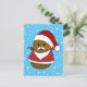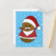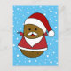 Funny brown Christmas potato sporting a fun white moustache and beard and wearing a red and white Santa hat and suit. The background is blue and spotted with white snowflakes.