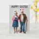 Designed with a light grey background, this card features an elderly couple standing close together, sharing an easy, affectionate grin. Both wear white headbands with pink-lined bunny ears 🐰, and the woman’s has small yellow and pink flowers tucked near the base for a sweet touch. She has neatly styled silver hair and glasses, smiling as she holds a bright blue smartphone in front of her chest, as if capturing the moment. Her outfit includes a denim overall dress, a soft pink cardigan, and pink flats with tiny blossom details, adding gentle color against the simple setting 🌷. Beside her, the man has a trimmed white beard and glasses, dressed in a brown jacket over a striped henley with blue jeans, leaning lightly on a polished wooden walking stick. Across the top, a seasonal greeting appears in thick, hand-drawn lettering, set in a dark tone that stands out clearly against the pale background. Soft, diffused lighting highlights their faces and the textures of the denim, knit cardigan, and wooden cane, with the bunny ears angled slightly outward above their heads.