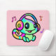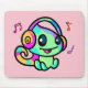 Happy smiling baby chameleon with headphones listening to music. Kawaii style.