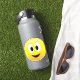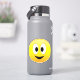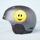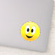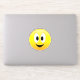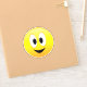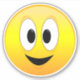 A big round happy yellow face. Round yellow face with big oval eyes and a jolly open smiling mouth.