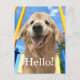 This cheerful postcard features a photograph of a smiling golden retriever dog, along with the word Hello! Customisable back text says, "Just wanted to say hi!"