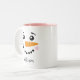 Cute holiday coffee or hot cocoa mug features a happy winter snowman (snow lady) girl face with warm rosy cheeks, carrot nose, eyes with pretty eyelashes, and smile made of coal. Snow white, black, pink and orange design colours. Personalise this winter seasonal mug with a first name or other custom text. The two-tone pink mug style can be modified.