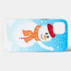 Blue, snowy, winter holiday iPhone case with a happy snowman waving. The snowman is on a separate layer so it can be easily resized or moved.