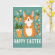 Designed with a sweet spring scene, this card features a stylized cat-like creature with long, pointed ears like a little hare 🐰. Orange stripes wrap its body above a white belly, and its closed eyes, rosy cheeks, and tiny pink tongue give it a tender, friendly look. The background is a muted teal, setting a calm stage that makes the warm orange tones stand out. Around the character, several orange root vegetables appear both singly and in small bundles, their leafy green tops leaning in as if gathered close together. Small white and yellow blossoms are sprinkled across the teal space, and a few white curling flourishes add gentle motion like a breeze through a garden 🌷. The shapes have a layered, cut-paper feel that adds soft depth without looking busy. Along the bottom edge, the words “HAPPY EASTER” sit in large white letters, centered and easy to read. Tiny blossoms and white swirls float near the upper corners against the teal background.