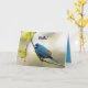 A greeting card featuring The word Hello and a photograph of an Indigo Bunting on the front. The words ''wishing you a happy spring" are on the inside with various birds.