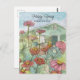 Happy spring in your new home featuring a house painted in soft sage green with a vibrant zinnia garden in the front yard hand drawn with ink and painted with watercolor in cheerful shades of orange, pink, and red. You can edit the text to fit your needs and add your business details on the back.