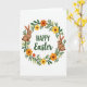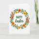 This greeting card features a circular wreath of deep green leaves mixed with lighter new sprouts, dotted with warm orange flowers with dark centers and smaller sunny yellow blooms. On either side of the wreath stand two long-eared animals in soft brown, facing inward with bright eyes and tiny red noses, as if sharing a shy, friendly glance 🐰. Tucked among the branches are a few decorated egg shapes with subtle patterns, suggesting a seasonal hunt. Centered inside the wreath, a seasonal greeting appears in thick green lettering, set in a casual, flowing style. The text sits neatly in the middle so the animals seem to “frame” it with their inward gaze 🐇. A plain white background keeps the wreath and characters easy to notice without extra clutter. Small leaf tips curl around the inner edge of the circle, with a couple of petals overlapping the greenery near the top.