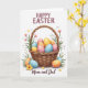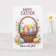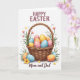 This Easter card shows a woven brown basket with fine texture and soft shading, filled with decorative oval eggs in gentle pastel blues, pinks, yellows, and oranges, each dotted with small white polka dots. Around the basket, sprigs of greenery and small blossoms in pink and sunny yellow lean inward as if gathered with care, adding a cozy, affectionate touch 🌷. A few eggs sit just outside the basket, spaced like they were set down by someone sharing the moment with a loved one 🐰. The lighting stays soft and even, giving the scene a calm, welcoming look without harsh shadows. Near the top, the words “HAPPY EASTER” appear in uppercase letters in a deep maroon color, centered above the illustration. Along the bottom, “Mom and Dad” is written in a flowing cursive style in a matching maroon tone, placed neatly beneath the basket. The background is crisp white, making the pastel eggs, green leaves, and tiny flowers stand out clearly.
