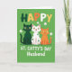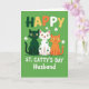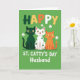 This card shows three stylised cats lined up across a deep emerald-green background, their bodies arranged in a steady horizontal row that feels close and companionable 💚. On the left sits a forest-green cat with sharp yellow eyes, leaning slightly towards the centre as if keeping the others company. In the middle, a white cat is dotted with small shamrock shapes, and its calm face seems to meet the left cat’s gaze in a quietly affectionate way ☘️. On the right, a ginger-orange cat finishes the trio with a soft smile that matches the friendly mood of the group. White shamrocks drift around them like light confetti, filling the space without crowding the cats. Near the top, “HAPPY” appears in rounded letters, alternating light green, orange, and white across the word. Along the bottom, “ST. CATTY’S DAY Husband” is set beneath the cats, and their bright golden eyes stand out against the flat, graphic colours.