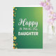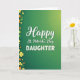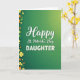 This card features the centered message “Happy St. Patrick’s Day DAUGHTER” in crisp white, set against an emerald-green gradient that shifts from a yellow-lime glow in the upper right to deep forest green in the lower left. “Happy” sits at the top in flowing cursive, “St. Patrick’s Day” follows beneath in a refined cursive style, and “DAUGHTER” anchors the stack in large all-caps sans-serif for emphasis. A soft drop shadow under the letters lifts the words slightly, like they’re floating above the background. Along the left edge, a vertical border of clovers and tiny star-like flowers adds a sweet, caring touch, as if someone took extra time to decorate it just for her 💚. The clovers and blooms are colored in warm yellow and orange with multiple greens, giving the side trim a lively contrast to the smooth backdrop ☘️. The border shapes have a subtle cut-paper look, with small overlaps and edges that create depth against the green field. In the upper right corner, the gradient’s lightest area glows behind the text while the lower left settles into a darker green wash beside the clover border.