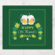 A bottle label with a festive Happy St. Patrick's Day design with 2 mugs of frosty beer and some clovers on a green background.
