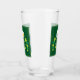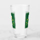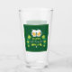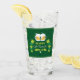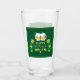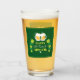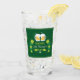 Drinking glass with a festive Happy St. Patrick's Day design with 2 mugs of frosty beer and some clovers on a green background.