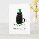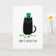 Cute Happy St. Patrick's day card featuring a black cat wearing a leprechaun hat sitting amongst shamrocks in various shades of green. Add your own text inside