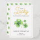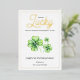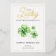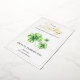 Happy St Patricks Day Green Four Leaf Clover Luck Foil Holiday Card features a green and white colour scheme with three green four-leaf clovers set against a white background. The foil "Lucky" script and black "Happy St. Patrick’s Day" text bring festive cheer. The backside is filled with a charming four-leaf clover pattern for added detail.