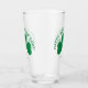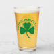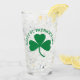 Celebrate St. Paddy's Day in style with a glass featuring a green shamrock leaf with the words "HAPPY ST. PATRICK'S DAY!" curved over it on the front and back.