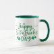 Celebrate St. Patrick's Day with this fun mug that says "Happy St Patrick's Day" in a green decorative script with heart accents and green shamrocks.