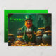 Cute Leprchaun in a cave with gold (illustration by AI - model n°1). Design on holiday postcard with Irish quote and greeting to personalise in the back.