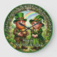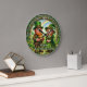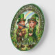 Invite the high-energy luck of the Irish into your home with the Happy St. Patrick's Day Leprechaun Luck clock. This festive timepiece features a vibrant, high-definition graphic capturing a whimsical scene under a stone archway. A cheerful leprechaun couple, dressed in traditional emerald green and plaid, stands amidst a field of four-leaf clovers, holding a overflowing pot of gold beneath a brilliant rainbow. The outer border is inscribed with the heartwarming blessing: "May Every Petal On The Shamrock Bring You Joy and Good Luck." While the design masterfully mimics the dimensional texture of a hand-painted ceramic or wooden plate, this is a durable high-definition graphic application on a premium clock face. It is a prestigious and joyful centerpiece for any St. Paddy's Day celebration or Irish-themed decor.