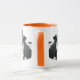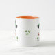 St. Patrick's Day mug featuring a watercolor image of a black and white cow adorned in a green top hat with a gold band and a white flower and shamrocks. The wording "Happy St. Patrick's Day" below image with green shamrock. Three small green shamrocks in front side of mug. Additional sizes and rim and handle colours available.
